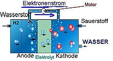 Jede Brennstoffzelle enthält zwei Elektroden, die Anode, an der Brennstoff (vorzugsweise Wasserstoff) zugeführt wird, und die Kathode, an der das Oxidans, reiner Sauerstoff oder Luft zugeführt wird. Die Anode und die Kathode sind durch einen Elektrolyten getrennt, so dass bei jeder chemischen Reaktion der Elektronenaustausch nicht lokal, sondern über einen äußeren Stromkreis stattfindet. Strom wird direkt aus der chemischen Reaktion gewonnen und kann beliebig eingesetzt werden.