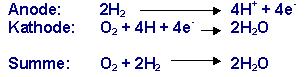 | | | Wasserstoff dient als Brenngas, Sauerstoff als Oxidans. An der Anode wird das Brenngas oxidiert, dabei entstehen Protonen H+, die durch den Elektrolyten zur Kathode wandern, während die Elektronen im äußeren Stromkreis auf Grund der Potentialdifferenz von der Anode zur Kathode fließen. An der Kathode wird Sauerstoff unter Aufnahme von Elektronen reduziert und das Reaktionsprodukt Wasser ensteht. |