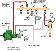 Die Commonrail-Einspritzung wurde schon vor langer Zeit erfunden, jedoch erst in den letzten Jahren eingesetzt. Eine Pumpe erzeugt in der gemeinsamen Kraftstoffleitung den hohen Druck. Von der gemeinsamen Kraftstoffleitung aus wird der Kraftstoff dann elektronisch jedem Zylinder über einen Injektor zugeteilt. Die überschüssige Menge läuft zurück in den Kraftstofftank. Vorteil dieses Systems ist, dass nur eine Hochdruckpumpe nötig ist. |