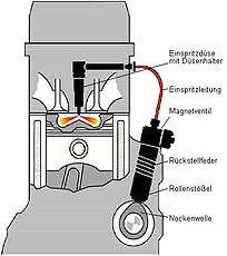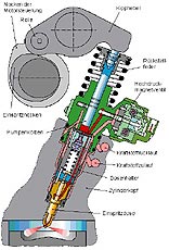 Das Pumpe-Leitung-Düse Verfahren arbeitet mit je einer Hochdruckpumpe für jeden Zylinder, die von einer Nockenwelle angetrieben wird und über eine Hochdruckleitung mit dem elektronisch angesteuerten Injektor verbunden ist. Mit jeder Umdrehung der Nocke wird die Pumpe betätigt und der Kraftstoff unter Hochdruck vom Injektor eingespritzt. Einspritzzeit und Menge wird elektronisch berechnet und gesteuert. |
